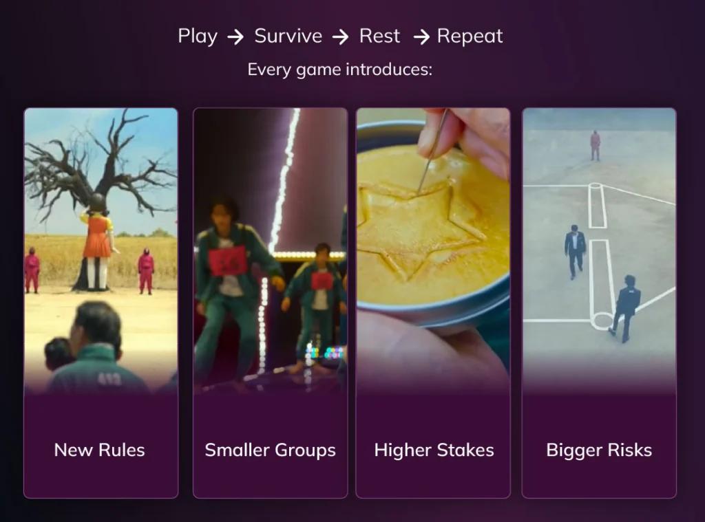 At its heart, Squid Game relies on a familiar game loop: Play → Survive → Rest → Repeat. Each game introduces tension and challenge, followed by a temporary reprieve. This creates a compelling rhythm that keeps players engaged. The suspense builds, resets, then builds again, like the pacing in mobile games or habit-building apps.