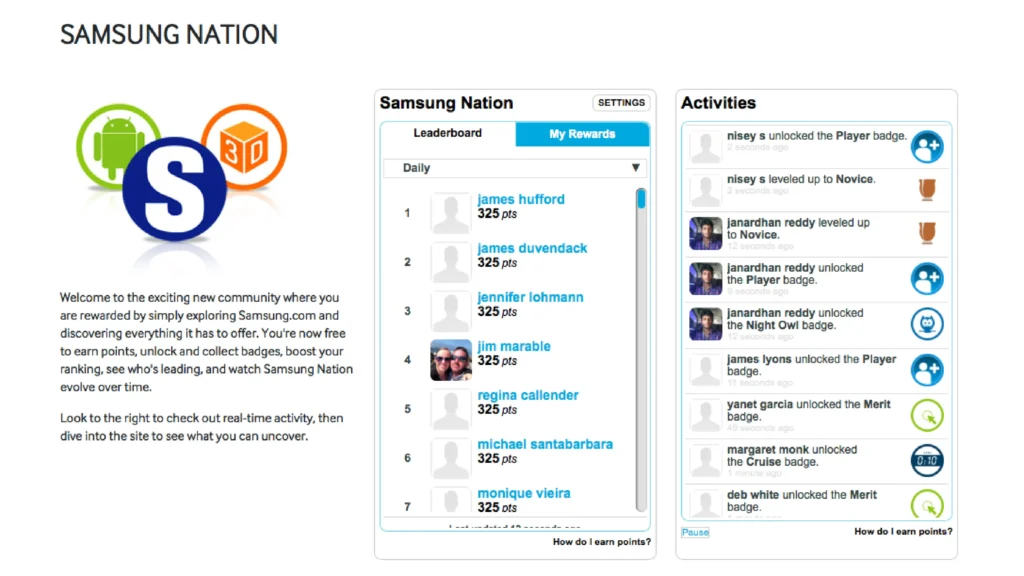 Samsung Nation built a gamified community where users earned badges, points, and leaderboard ranks for posting reviews, engaging in forums, and exploring product content.