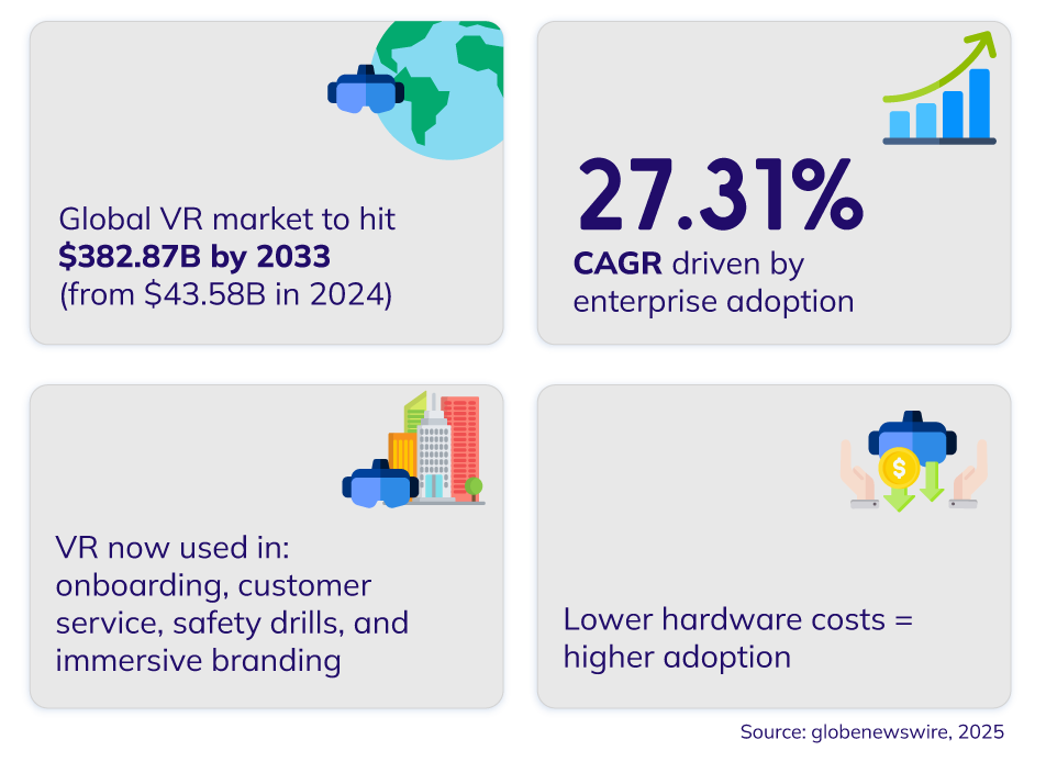 Enterprises across industries are embracing VR at an unprecedented rate. With a 27.31% compound annual growth rate (CAGR), the surge in adoption is largely driven by practical business needs, particularly in talent development, brand engagement, and operational efficiency.