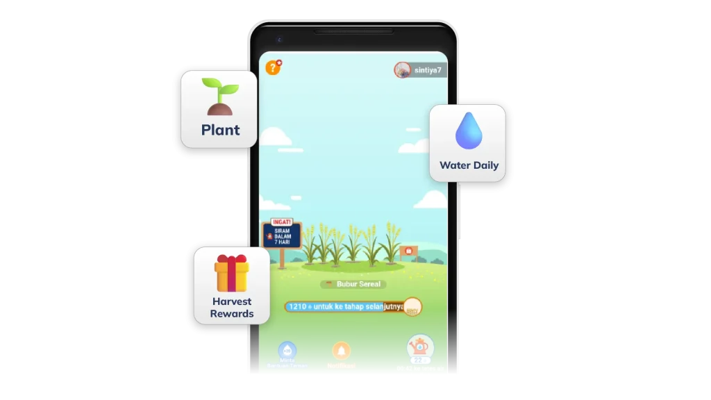In this feature, users plant virtual crops inside the app and must return daily to water them. As the plants grow, users eventually harvest rewards such as vouchers or coins.